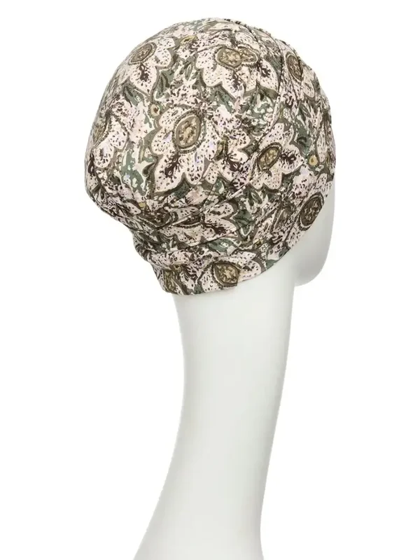 De “Moroccan Romance” uitvoering heeft een elegante paisleyprint met grote florale accenten in kleurrijke details. Warme groentinten, gecombineerd met zachte roze, lichtblauwe en een subtiele toets van mosterdgeel, geven deze turban een frisse en stijlvolle lente-uitstraling.