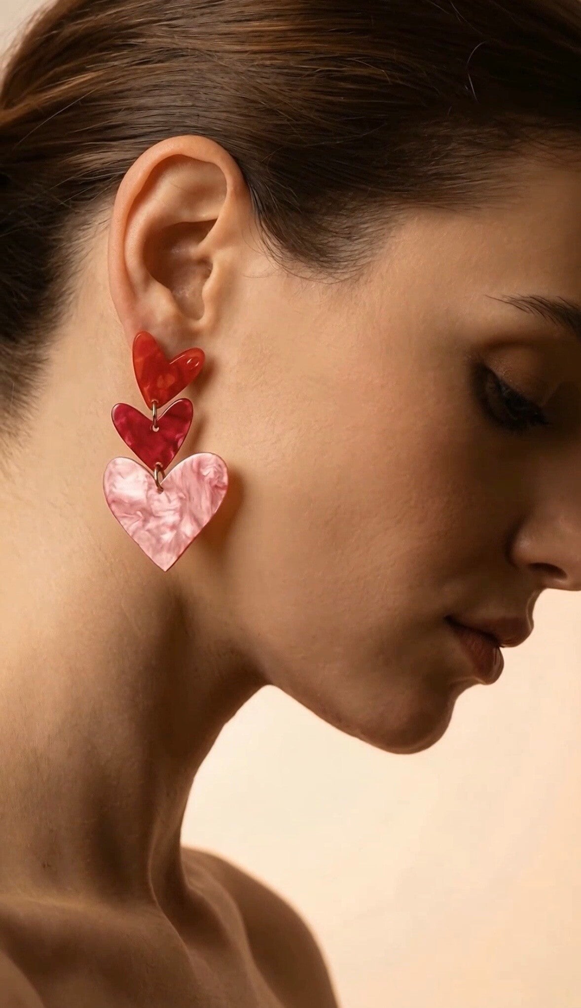 Speels, vrouwelijk en vol charme. Deze elegante oorbellen met hartjes in warme tinten roze en rood brengen meteen een zachte, romantische uitstraling.