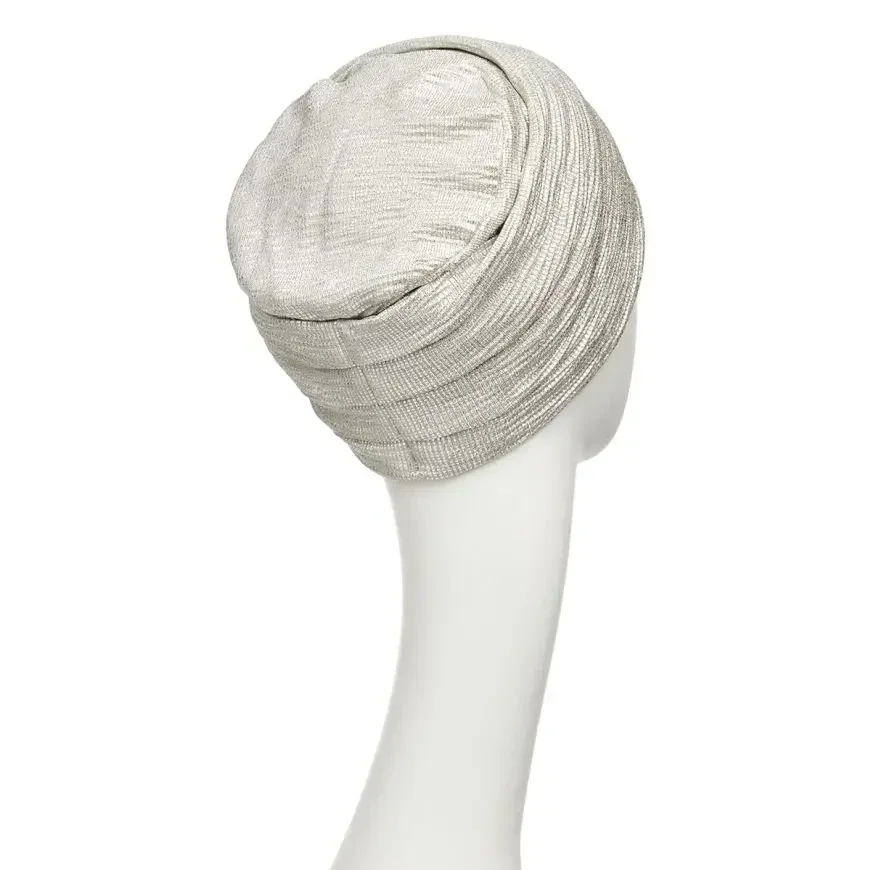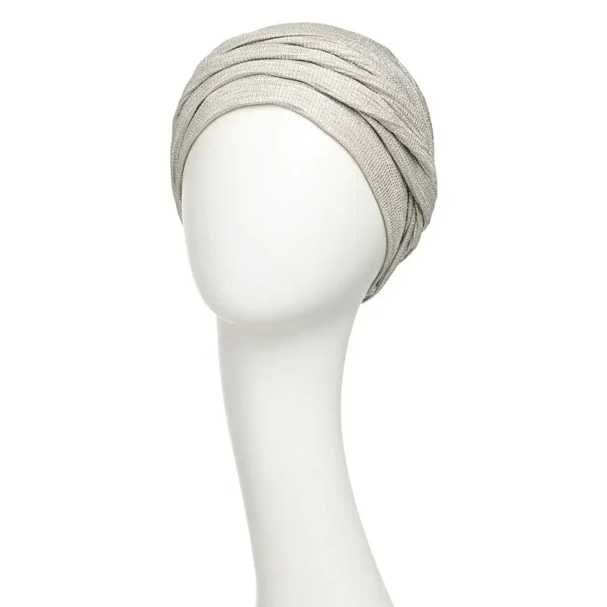 Deze is een tijdloos mooie, eenvoudige tulband met een verfijnde design twist die hem net dat beetje extra geeft. De 'Silver Charm'-versie is gemaakt van een elastische zilverkleurige stof die prachtig te combineren is met allerlei outfits. Charme ontmoet comfort... en glitter is altijd een goed idee.
